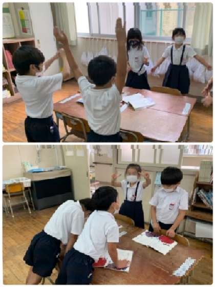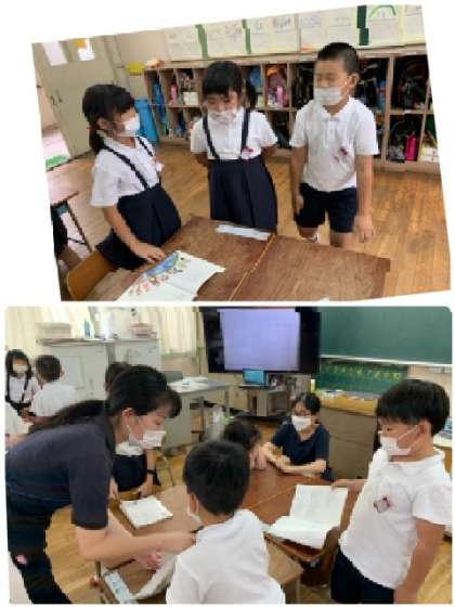 1年2組の国語の授業の様子です。単元「おおきく なあれ」の学習をしています。音読発表に向けて、班で役割分担を決めたところから、音読練習をしています。手ぶりを入れたり、工夫もしています。