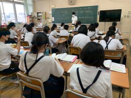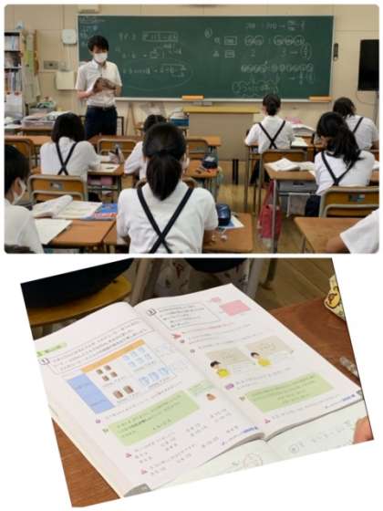 6年生の算数の授業の様子です。今日は、「比」と「比の値」について学習しました。最後に、問題を解いて先生に確認してもらっていました。