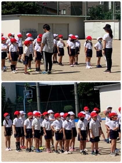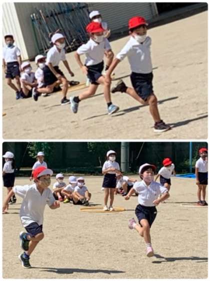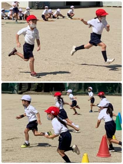 久しぶりの運動場に、1年生児童が集合しました。最初に整列練習をしてから、グループに分かれて、走競争をしました。