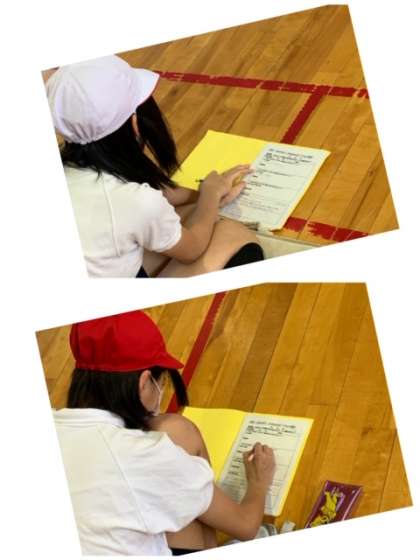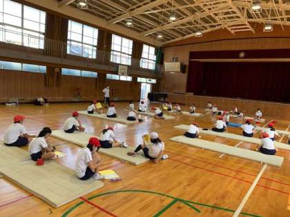 5年生の体育の時間の様子です・1・2組合同で「マット運動」に取り組みました。最初に、上手にできるためには、どんなところを気をつけながら取り組んだらよいのかを考え、体育ノートに書き込みました。