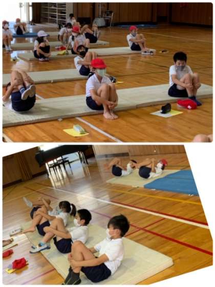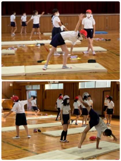 ウォーミングアップに、基礎となる動きで体を慣らしてから、各自が取り組む種目を決めて練習を始めました。種目は、「前転」「後転」「側転」の中から選んでいます。「側転」に挑戦している児童が多いようです。