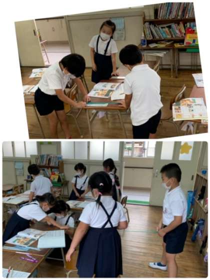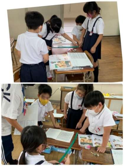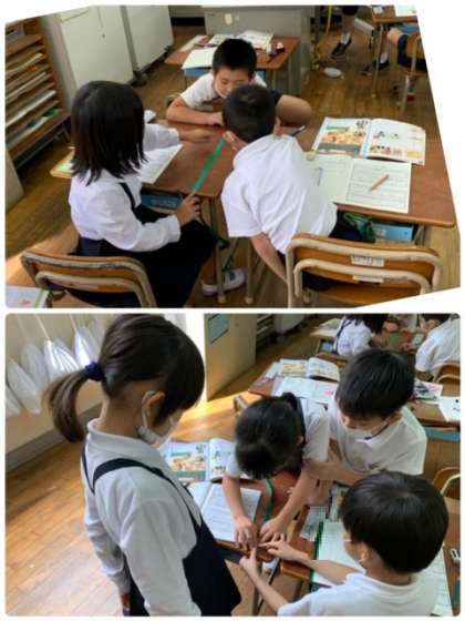最初に比べるものは、児童机の縦の長さと先生の机の高さです。班で協力して取り組んでいます。