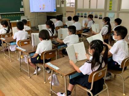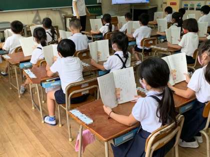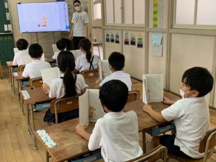 今日は、単元「かいがら」の学習です。まずは、みんなで音読をしています。1文ずつ交代で・・・。しっかりとした発声で音読しています。