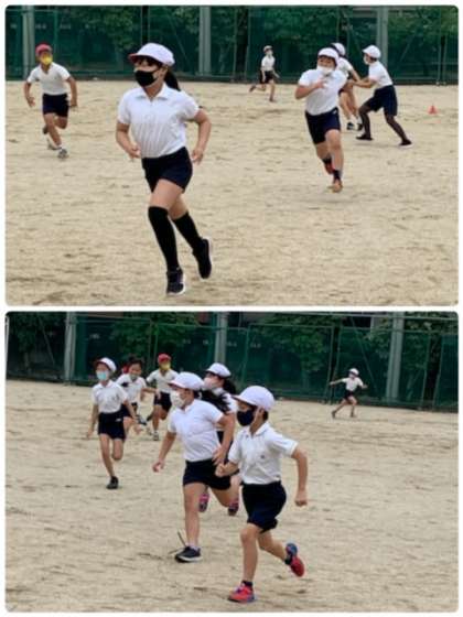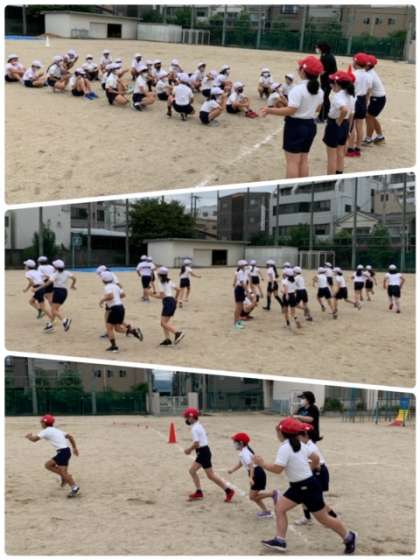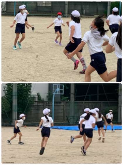 ウォーミングアップです!帽子の色が赤の鬼役の児童が、みんなをつかまえに運動場中を走ります。