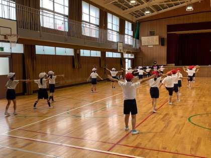 1年生の体育の時間です。1・2組合同で、運動会に向けて集団演技のダンスの練習をしています。