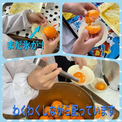 今日の給食は「チキンカレーライス(米粉)、キャベツとコーンのサラダ、冷凍みかん、牛乳」でした。冷凍みかんは最後のデザートとして食べましたが、早くに食べ終わった人はまだ凍ったままだったようで、「先生、氷がある!」「つめたすぎる〜!」「中がカチカチ!」とびっくりした様子。