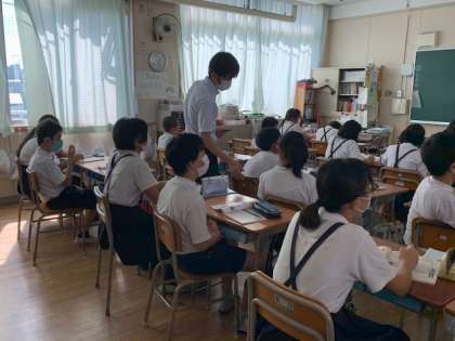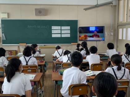 6年生の外国語の時間の様子です。今日の学習のめあては、「夏休みの思い出をまとめよう」です。最初に、いろいろな国の子どもたちが、夏休みの思い出を話している動画をみました。それらを参考に、自分の夏休みの思い出を英文でまとめます。