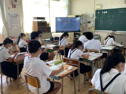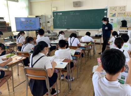 5年1組の社会の時間の様子です。「外国産が安い理由」について、資料集を見ながら考えています。