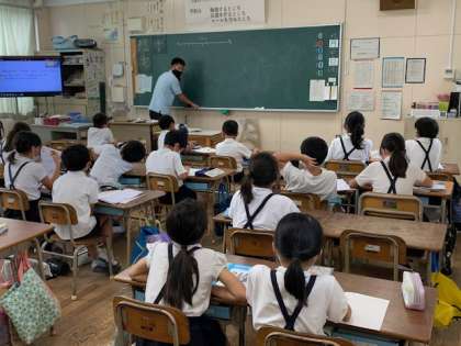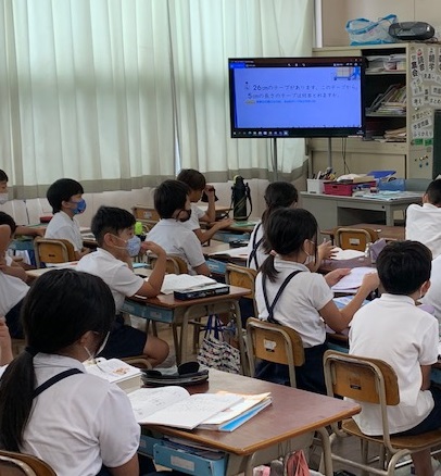 3年生の算数の授業の様子です。問題「26cmのテープがあります。このテープから、5cmの長さのテープは何枚とれますか。」に取り組んでいます。先生と一緒に、どのように考えていったらよいのかを考えています。