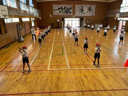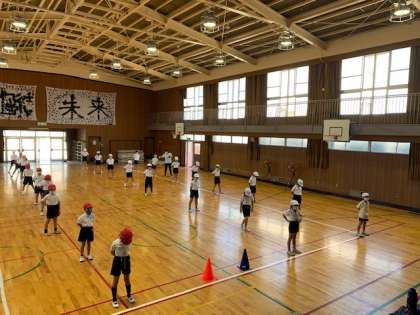 2年生の体育の時間です。運動会に向けて、集団演技のダンスの練習をしています。