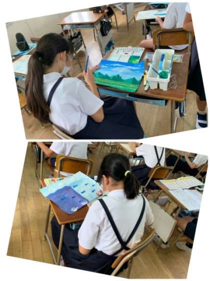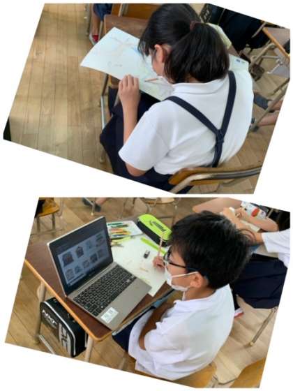 5年2組の図工の時間の様子です。「環境」をテーマに図案を考えて描いています。図案に悩んだときは、学習用端末も活用して参考にしていました。