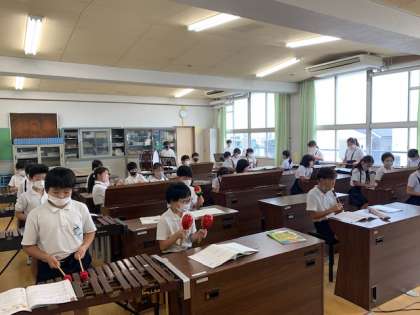 4年生は、「豊かな響きを味わいながら、演奏しよう」をめあてに、曲「茶色の小瓶」を練習してきました。少ない練習時間だったのですが、がんばって、みんなで合奏しました。