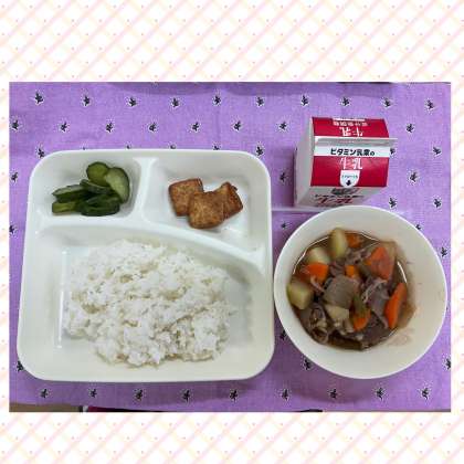 今日の給食は「ごはん、肉じゃが、あつあげのみそだれかけ、あっさりきゅうり、牛乳」でした。昨日の茶色が多い献立とはまた違い、きゅうりの緑が色鮮やかでした。