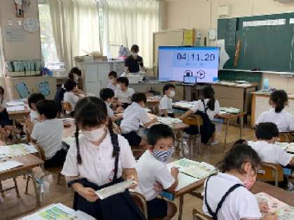 1年2組の算数の時間の様子です。授業の初めに、「百ます計算(1年生の問題数は、少ないです)」に取り組んでいます。時間を計って取り組みます。取り組んだプリントは、班長さんが集めてくれました。