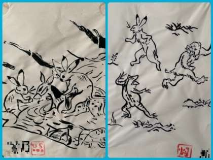その「鳥獣戯画」の場面の中から好きな場面を選び、墨を使って描いています。