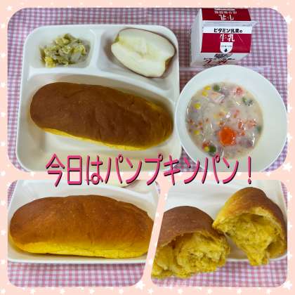 今日の給食は「パンプキンパン、コーンクリームシチュー(米粉)、はくさいのピクルス、りんご、牛乳」でした。米粉のシチューはなめらかで、ラッキーにんじんも入っていて大好評。はくさいもさっぱり。りんごは程よい甘みと酸味。