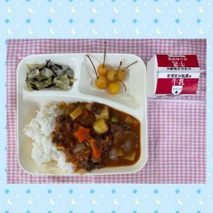 今日の給食は「ハヤシライス(米粉)、キャベツのひじきドレッシング、さくらんぼ(缶)、牛乳」でした。米粉を使ったハヤシライスは小麦粉のルウよりあっさりした仕上がりでした。ひじきドレッシングは、給食によくでる献立です。気づけば野菜もひじきも食べることができる人気の献立です。