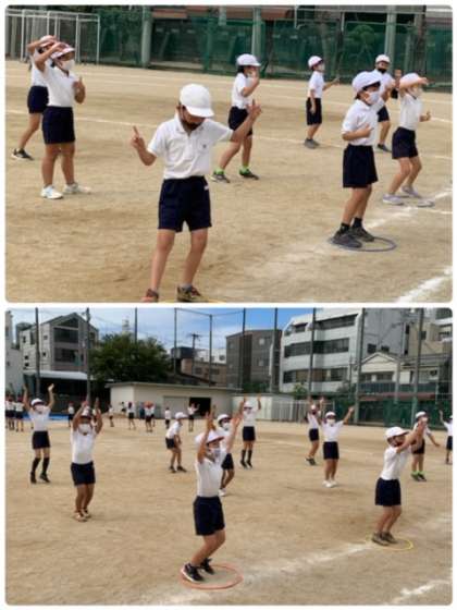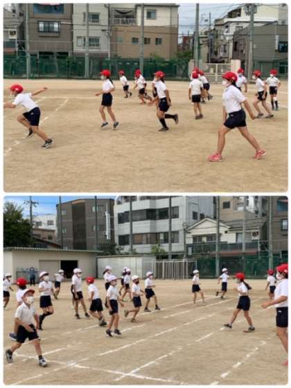 3年生の体育の時間です。運動会の集団演技ダンスの練習をしています。今日は、運動場で立ち位置や場所移動などを練習していました。児童席側と保護者優先スペース側の児童が、途中で入れ替わります。