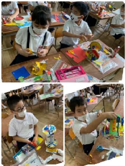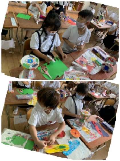 1年1組の図工の時間です。作品「かみざらコロコロ」が完成間近です。