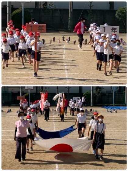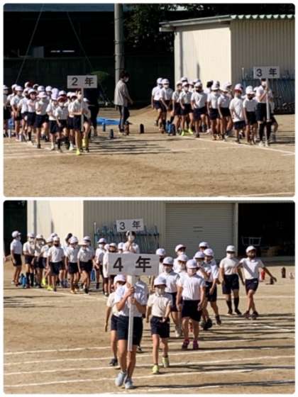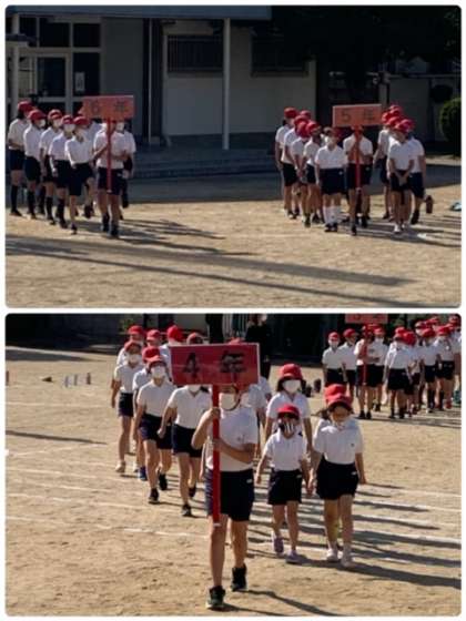 児童席の位置を確認した後、入場行進の練習をしました。児童席前から前進してきます。
