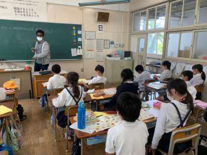 それぞれ5個のおはじきが配られました。各自が選んだイラストの上に、おはじきを置いています。そこに、C−NETの先生が選んだものを英語で伝えます。5つ当たれば「ビンゴ!!」です。