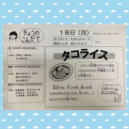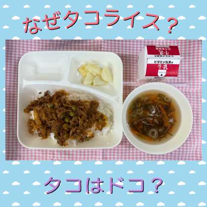 今日の給食は「タコライス、もずくのスープ、焼きじゃが、牛乳」でした。子どもたちの中には先週から「タコライスって?」と思っている人がたくさんいました。「たこ飯」と訳する?ひとも。「タコ」=「蛸」ですね。さてタコライスとは・・・。正解は今日の給食カレンダーにあります。「たこ焼きのたこじゃないんやぁ」とか「先生、私たこ苦手・・・」などなどいろいろ話を聞きながら、でも正解がわかったらみんな「これかぁ!」と大喜び。おいしくいただきました。