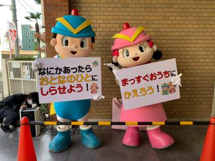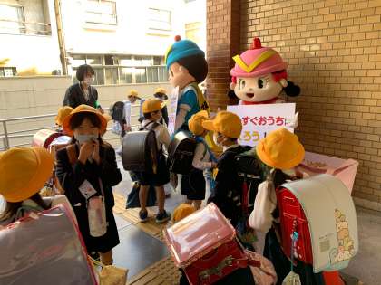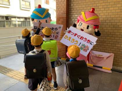 「フーくん」と「ケイちゃん」はメロディに合わせて、児童たちへのメッセージボードを持って、見送ってくれました。メッセージボードには、「まっすぐおうちにかえろう!」「なにかあったら おとなのひとに しらせよう!」などが書かれていました。