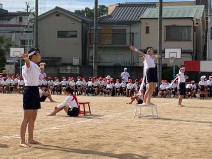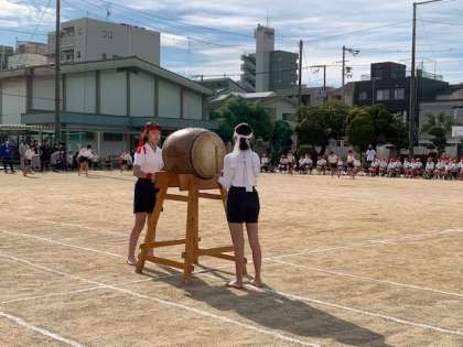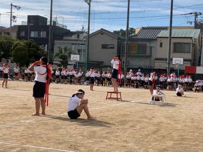 プログラム2番応援合戦です。太鼓の音とともに応援団が入場してきました。赤白双方とも、応援団長を中心に力強い応援を見せてくれています。