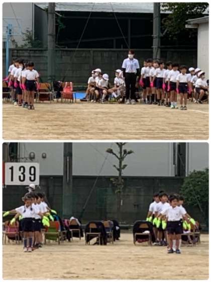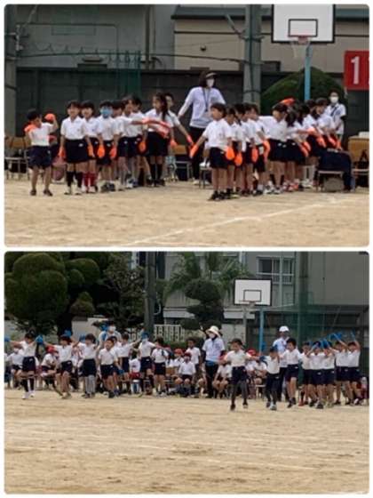 プログラム7番、低学年団体演技「わらって!おどって!!いざ、すすめ!!!」です。1・2年生が入場してきました。
