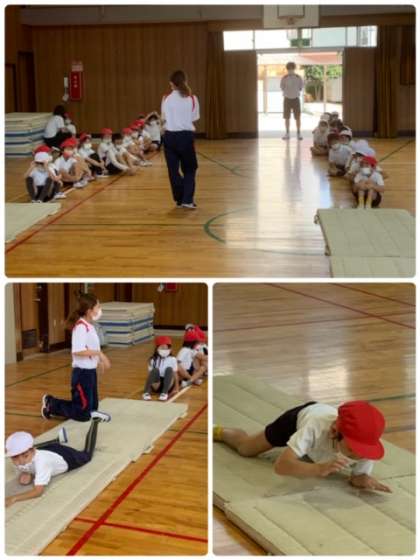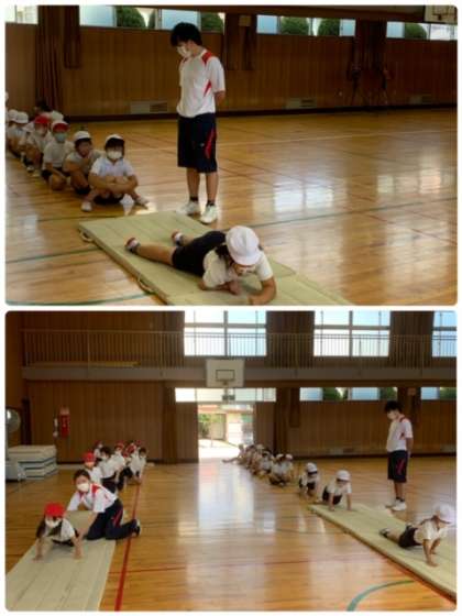 4年生に続いて、2年生もプロノインストラクターの方に指導していただきました。マットの上で、いろいろな動きをしています。