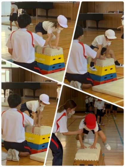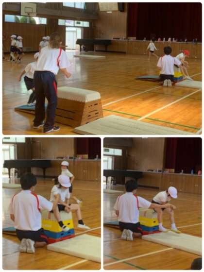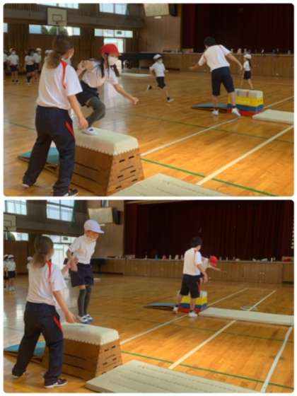 その動きを使って、跳び箱にも挑戦しました!最初は、走って、踏み切って・・・跳び箱の上に。次は、手をついて・・・。順番に正しい動きを練習させてもらいました。