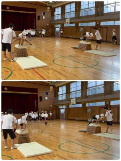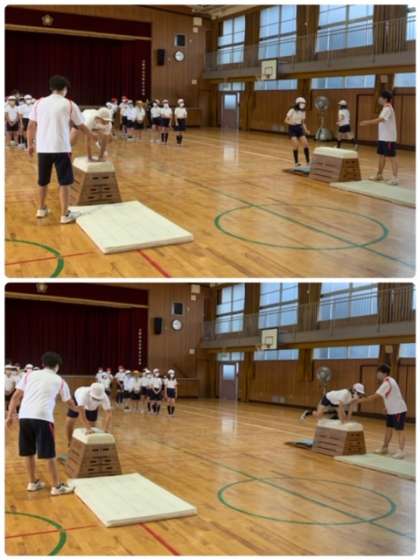 実際に跳び箱を使っての練習。最初は低い跳び箱で、踏み切りや跳ぶ際の姿勢などを気を付けながら取り組みました。さすが5年生です。低い跳び箱は、難なくクリアーしています。