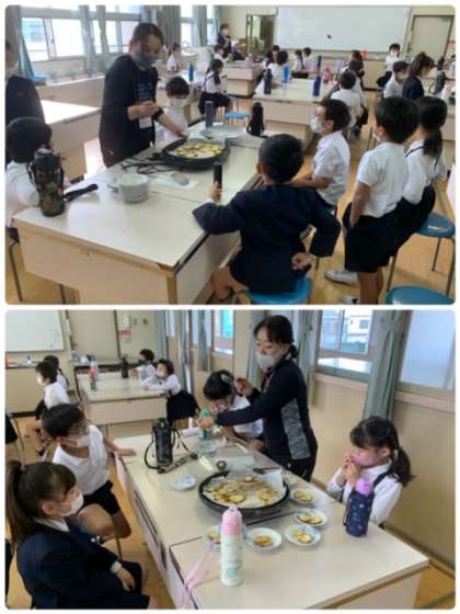 クイズに盛り上がっている間に、先生方がホットプレートでさつまいものスライスを焼いてくれました。おいしそうな匂いが、廊下や職員室の方まで届いていました。