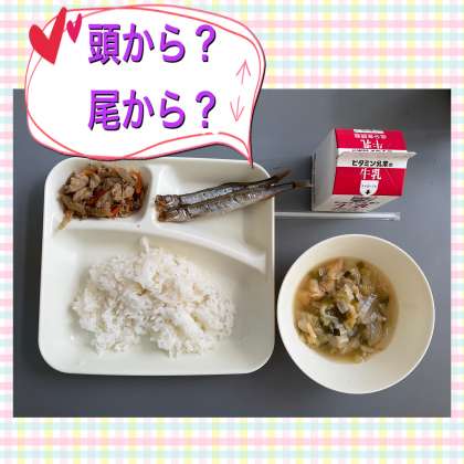 今日の給食は「ごはん、焼きししゃも、五目汁、きんぴらごぼう、牛乳」でした。今日のししゃもはやや大きめ。大好きな子は、「もっと食べたい!」と。そしてちょっと苦手な子は「頭も食べれるの?」「尾っぽは?」「骨は?」とあれこれ。そして、なかなか進まない子のところに行くと、「ししゃもが見てる」・・・なるほど。目が合うようで気になってしまうそうです。また他の子は、後は尾っぽ側の半分くらい。ちょっとずつ食べては、はぁ〜とため息をついています。それでも少しずつ食べていき、ついに最後の一口!食べきった時はとってもいい顔。ししゃもも自分の体も喜んでいるね。ごちそうさまでした!