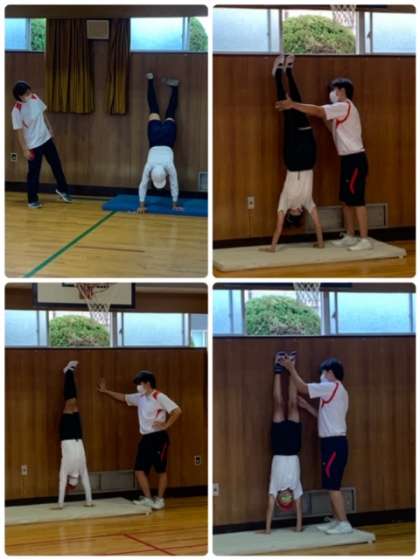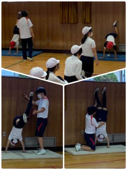 できた児童は、手をついて倒立姿勢をつくる方法に挑戦。インストラクターの方の助言を聞きながら、積極的に取り組んでいました。