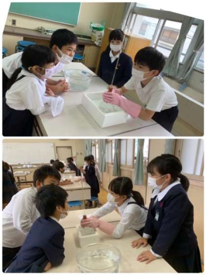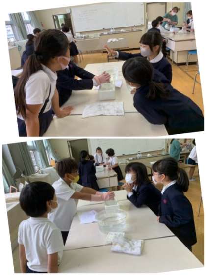 最初に、水の体積はどう変わるのか予想をたてて実験に入りました。「冷やすと・・・」「あたためると・・・」それぞれどうなるのか確かめました。実験の様子を見ていると、どの班でも、目に見えて変化が出ていました。その結果を見て、4年生のみんなの表情がいきいきとして見えました。実験成功のようです。