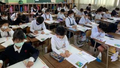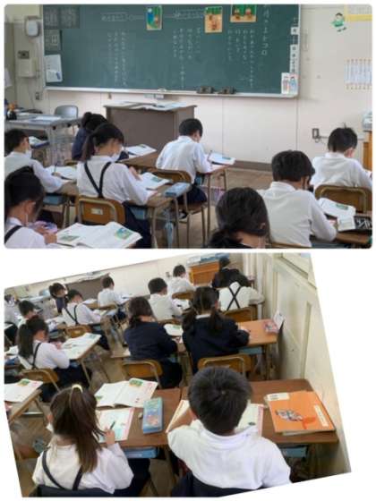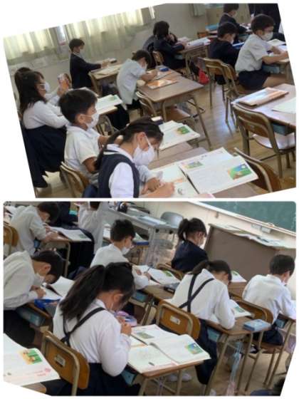 2年生の道徳の授業の様子です。読み物教材「お月さまとコロ」を読んで、コオロギのコロの感情や考えが変化していく様子を、みんなで考えていきました。そこから気づいたことを、道徳ノートに書き込んでいます。一人ひとりが、真剣に考え、書き込んでいる様子が伺えました。