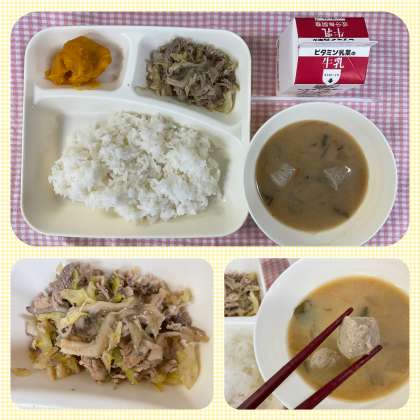 今日の給食は「ごはん、豚肉とまいたけのいためもの、いわしのつみれ汁、かぼちゃうろう、牛乳」でした。いわしの身でつくった「つみれ」は、みんななかなか食べる機会がないようです。はじめて食べる子が、おそるおそる口に入れて、しばらくそのままモゴモゴ・・。(ほっぺたがぽこんとふくらんでいました)噛んでみて、あぁこんな感じかとわかったようです。