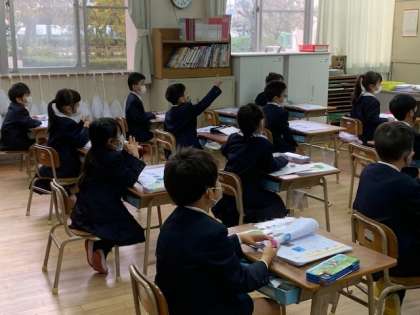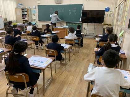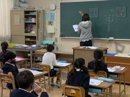 1年1組の国語の時間です。授業の初めに「カタカナ」と「漢字」の練習をしています。今日、練習している字は、「耳(みみ)」と「ソ」「オ」です。