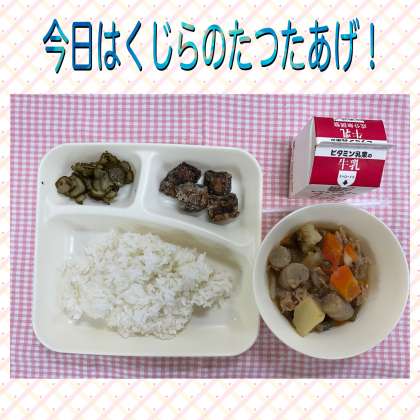 今日の給食は「ごはん、くじらのたつたあげ、豚肉とじゃがいもの煮もの、きゅうりの赤じそあえ、牛乳」でした。今日は何といってもくじらの日です。昔の給食では定番の食材だったそうですが、今ではなかなか食べる機会のないくじら。今日はシンプルにたつたあげで登場です。真っ赤な肉に下味をつけ、でんぷんをまぶして油で揚げます。出来上がると、黒っぽいのですが、柔らかくとてもおいしい仕上がりに、みんな大喜び。