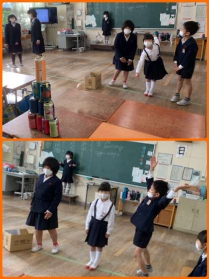 7・8班の「的当て」を3年1組の教室でしていました。低学年・中学年・高学年それぞれ距離を変えてあります。低学年の児童が、積み上げられた缶を、みごと倒すことができ、同じ班の児童が大喜び!