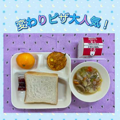 今日の給食は「食パン、豚肉と野菜のスープ煮、変わりピザ、みかん、いちごジャム、牛乳」でした。変わりピザは給食の定番メニュー!今日も大人気でした。ぎょうざの皮にチーズ、ツナ、ピーマン、ピザソースを混ぜたものをのせて焼いたら出来上がり。作り方は簡単なので、おうちでもいかがでしょうか。