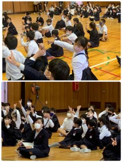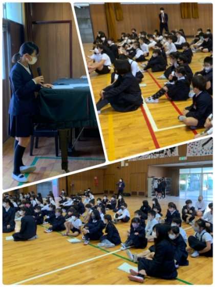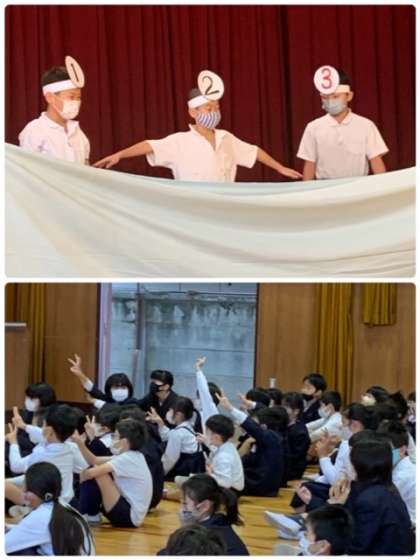 11月19日(金)、久しぶりに講堂に集まって児童集会を実施しました。児童たちは、笑顔で、講堂に集まってきました。今日は、集会委員会企画「本当なのは、だれでしょう?」をしてくれました。
