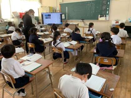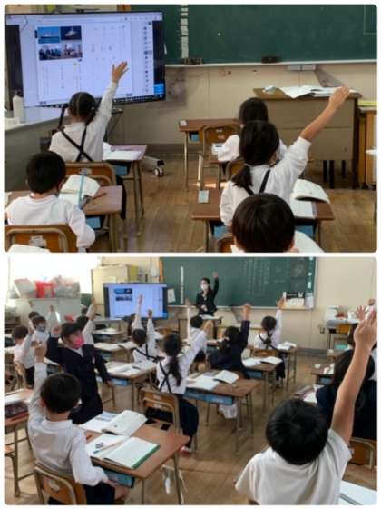 1年2組の国語の時間です。新しい単元「いろいろなふね」の学習に入ります。今日のめあては、「のりものについて かんがえよう」です。自分が乗ったことがあるのりものを出し合いました。みんなの前で発表したり、班で交流しています。