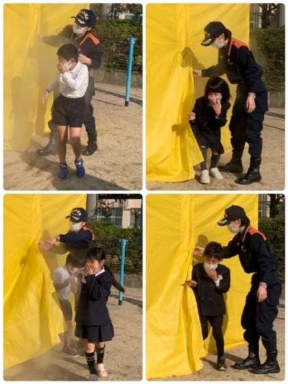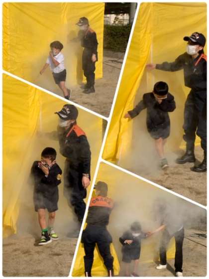 煙は上に上がっていくので低い姿勢になること、周りが見えにくいので壁などを手探りでなど、大切な注意点を教えてもらいました。