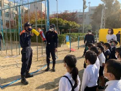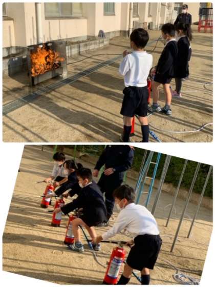 西消防署の方より、「水消火器」の使い方も教えてもらいました。まず火事を見つけたら「火事だー!」と大きな声で叫ぶこと。そして消火器を使う時の合言葉「ピン・ポン・パン」。
