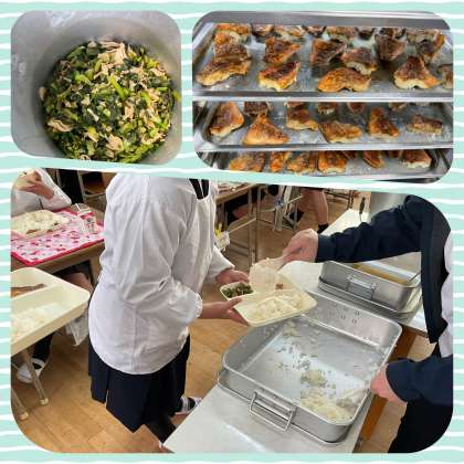 今日の給食は「ごはん、あかうおのしょうゆだれかけ、みそ汁、こまつなのいためもの、牛乳」でした。あかうおは焼き物機で焼き、しょうゆだれをかけています。骨が少なく、食べやすい魚です。こまつなは味よく、野菜が苦手という子でも食べやすい仕上がりでした。1年生でも「こまつなおいしかったよ。」の声をたくさん聞けました。今日の献立は、ごはんがすすみ、おかわりする姿もたくさん見ることができました。ごちそうさま!!