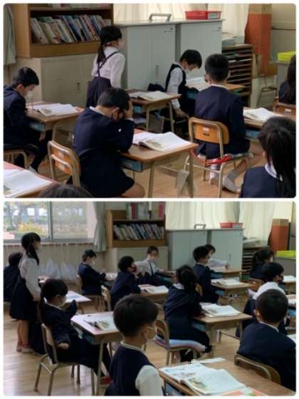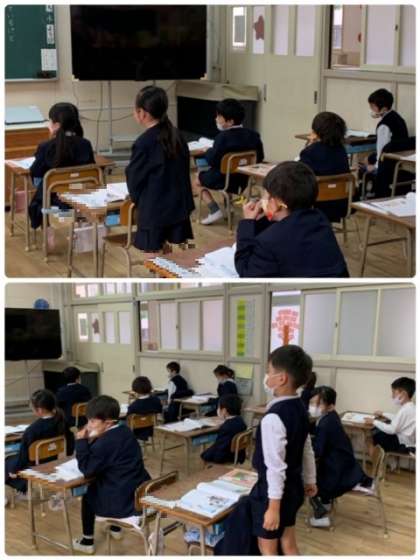 1年1組の道徳の時間です。読み物教材「そろって いるけど」を読んで、学習を進めています。けんじくんが、いつも、学級ボールやトイレのスリッパをそろえてくれています。けんじくんが休んだ日、いつもけんじくんが、やってくれていることに気がつき・・・。学級のみんなの思ったことやけんじくんの気持ちについて考え、発表しています。