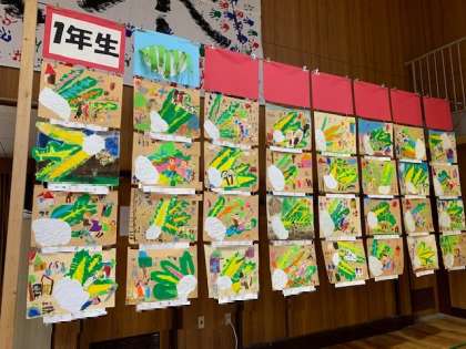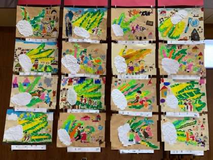 九条北小学校「展覧会」の作品を、写真で紹介します。1年生の平面作品は「大きなかぶ」です。国語の時間に、おはなし「大きなかぶ」の学習をしました。お話を読んで感じたことを、作品に表現してくれています。