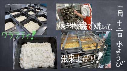 今日から3学期の給食。デザートがあるので、みんな楽しみにしてくれていました。コーンフレークをしきつめ、やわらかな生地を流し込み白桃の缶詰を混ぜて焼いた「桃のクラフティ」は、甘すぎないので食べやすかったです。